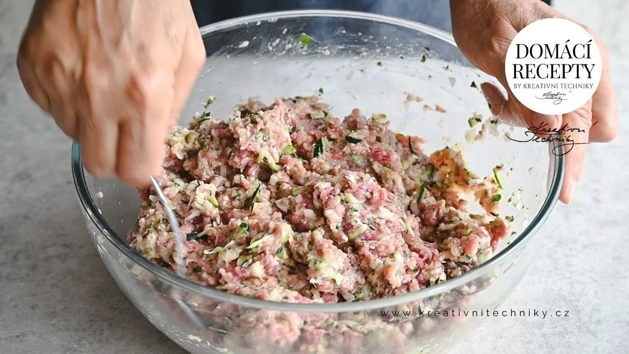 Nahrubo nastrouháme cuketu, necháme ji stranou a zatím připravíme další suroviny. Do velké mísy postupně vkládáme jednotlivé suroviny. Protlačený česnek, najemno pokrájenou cibuli, bylinky a sůl. Vše rozmačkáme vidličkou, aby se propojily chutě. Přidáme důkladně vymačkanou cuketu. Vymačkáme z ní šťávu a použijeme ji na zvlhčení nakrájených rohlíků. Rozmačkáme je vidličkou a přidáme do mísy spolu s vejcem, moukou a strouhankou. Opepříme, přidáme mleté maso a vše důkladně a co nejrychleji promícháme.