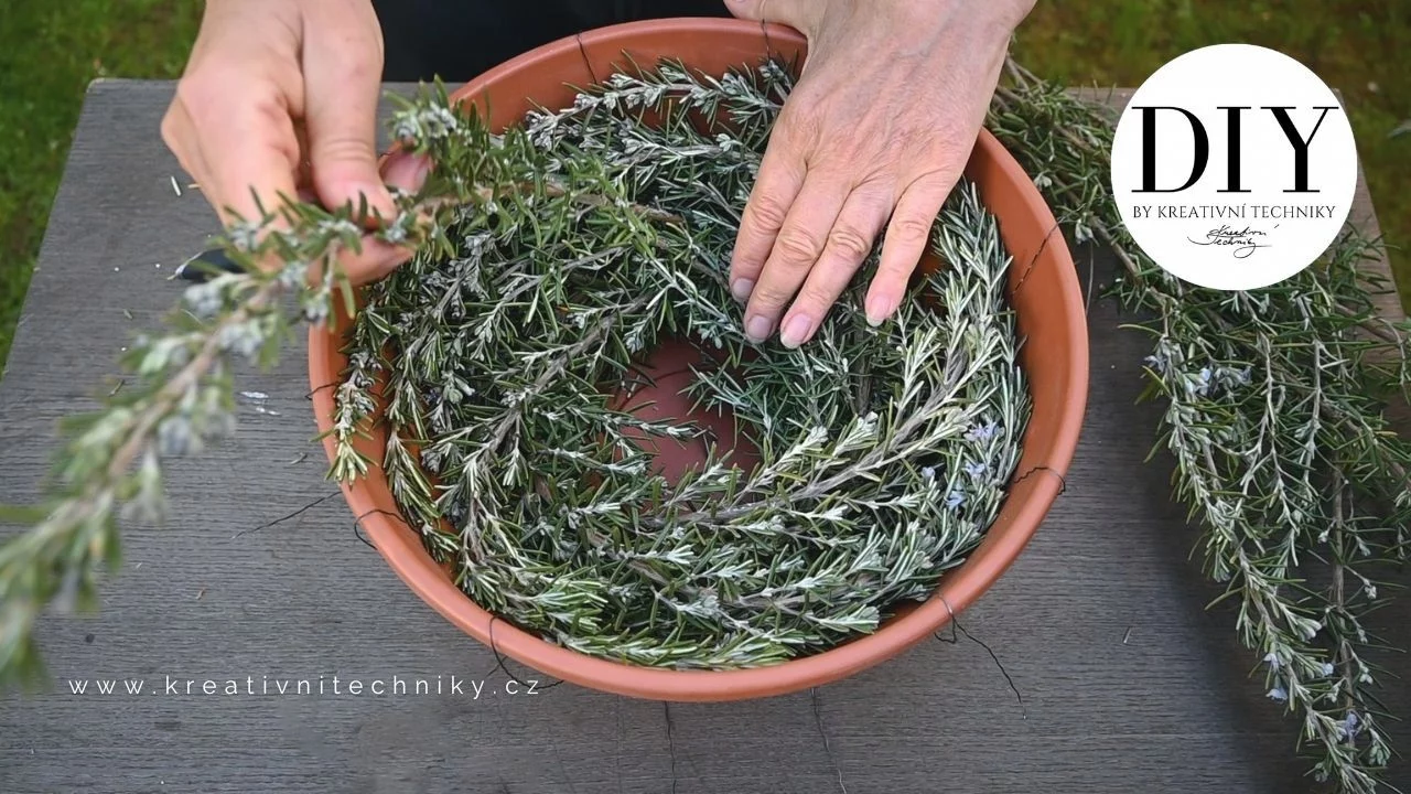 Dovnitř nádoby dokola po celém obvodě rovnoměrně naskládáme větvičky rozmarýnu. Potom je už jen postupně jemně obtočíme a rovnoměrně stáhneme připravenými drátky. Vytvoříme tak jednoduchý pravidelný kruh. Hotový věnec vyndáme z květináče. V případě potřeby jej můžeme ještě trošku poupravit. Odstřihneme případné přečnívající větvičky. Odstřihneme a zahneme konce drátků a věnec je hotový.