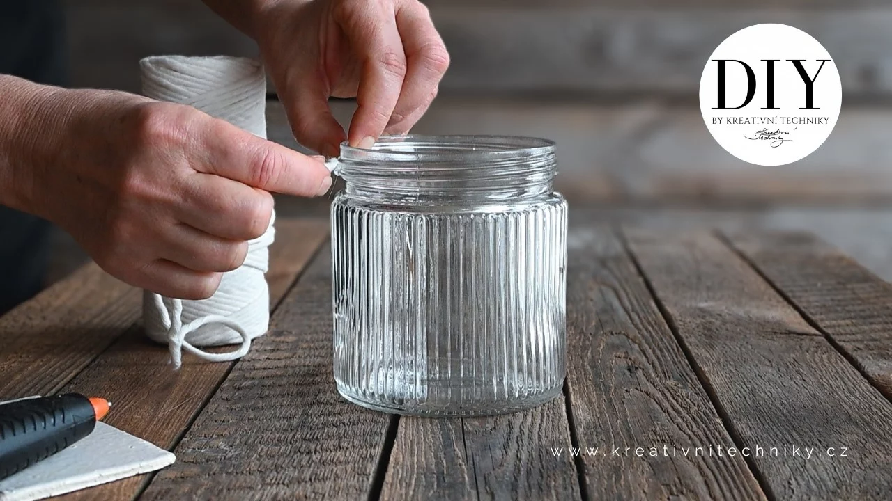 Horní okraj skleněné nádoby obtočíme několika řadami bílé šňůry. Tak si vytvoříme podklad pro lepení a nepoškodíme tím nádobu. Jednotlivé kytičky připevňujeme pomocí tavné pistole. Na spodní část květu naneseme malé množství horkého lepidla a přitlačíme jej na vybrané místo. Lepíme je rovnoměrně kolem celého okraje nádoby. Necháme lepidlo zchladnout, do středu nádoby vložíme svíčku a velikonoční dekorace je hotová.
